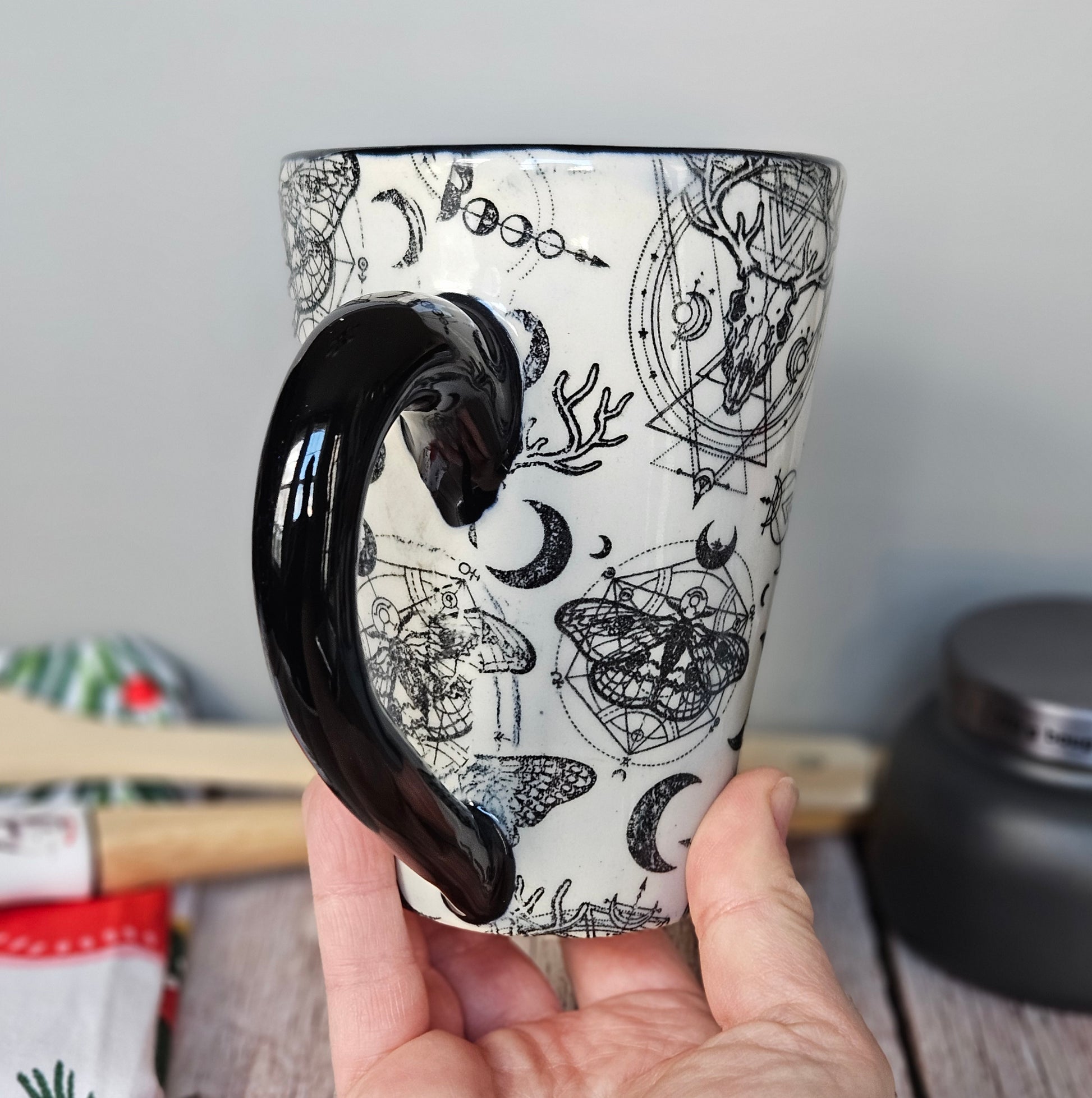 This is a apothecary mug with various themed images around the outside of the mug. There is a nice angle to the mug and the mug holds 10 oz. Of fluid.