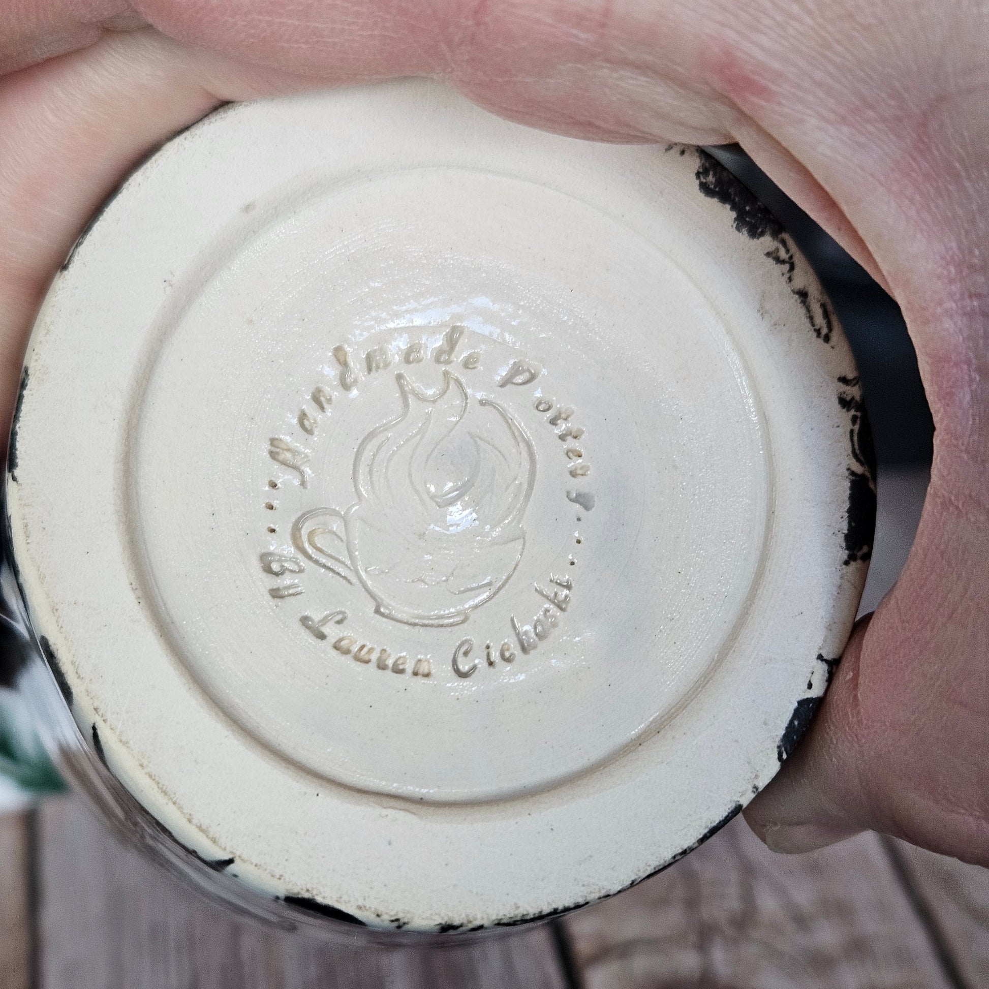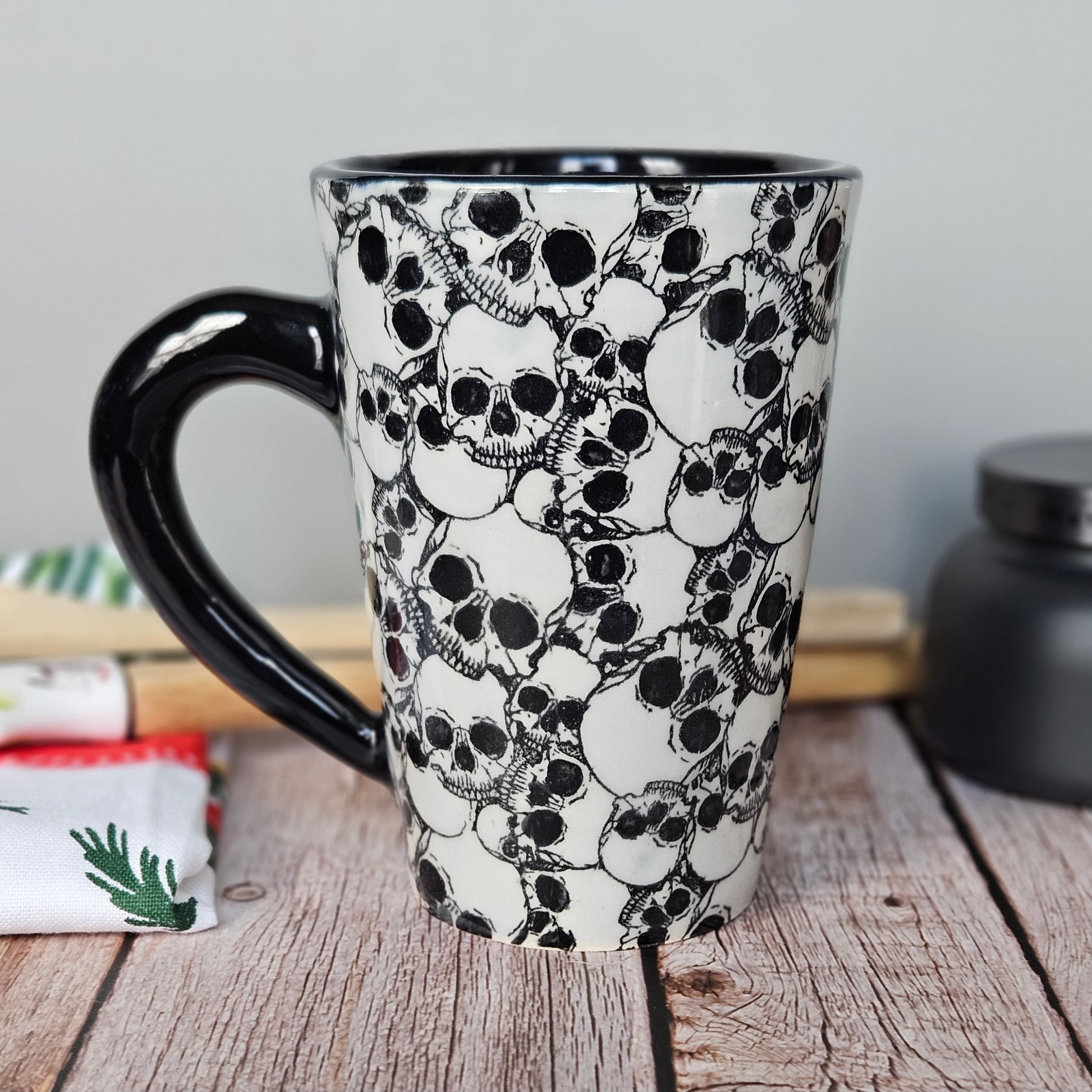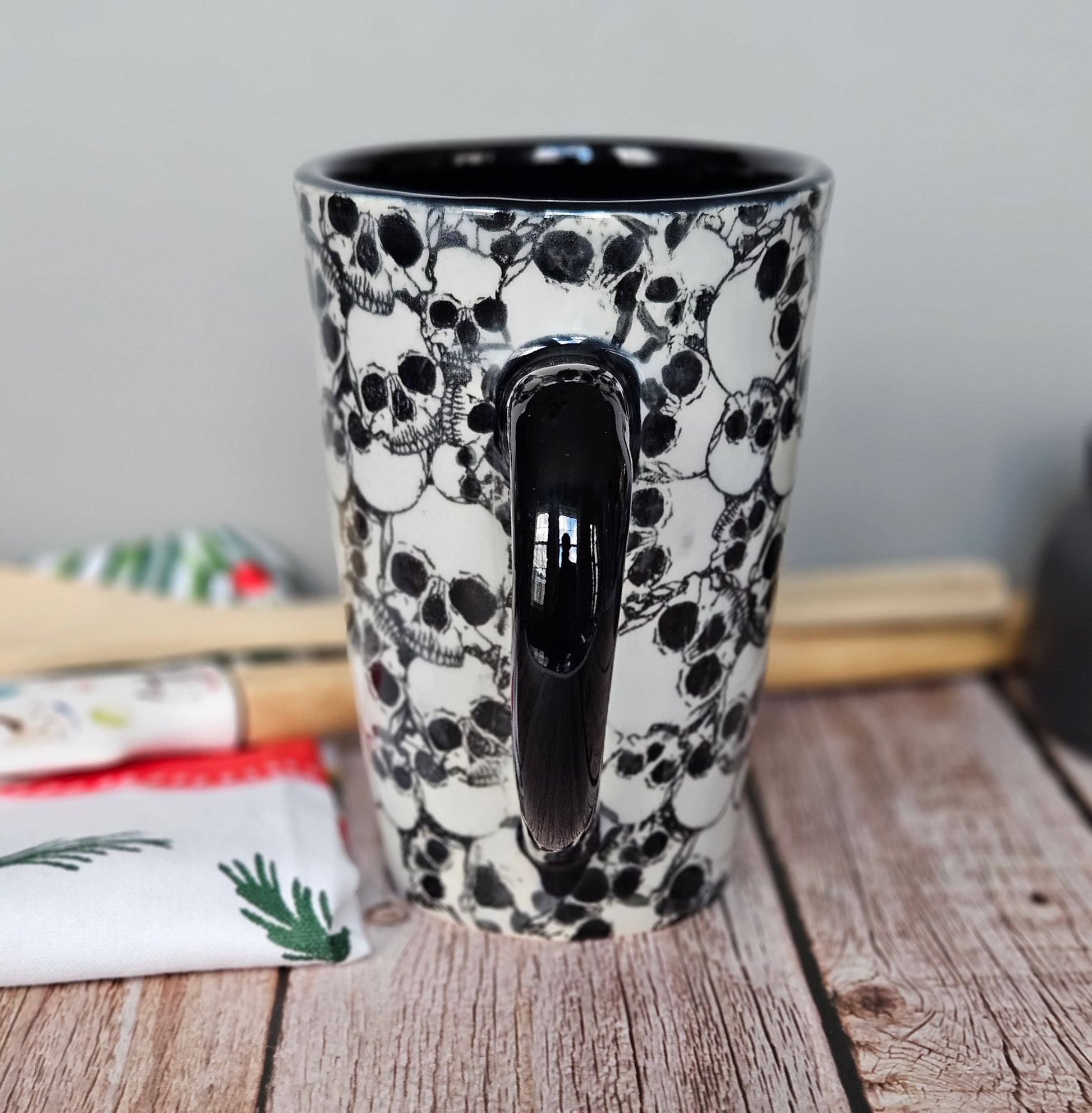 This mug is a 10 oz skull mug with skulls all over the front and back. The inside is lined with black glaze and the handle is also glazed black. This mug is dishwasher and microwave safe and will be a great addition to your skull drink ware collection.
