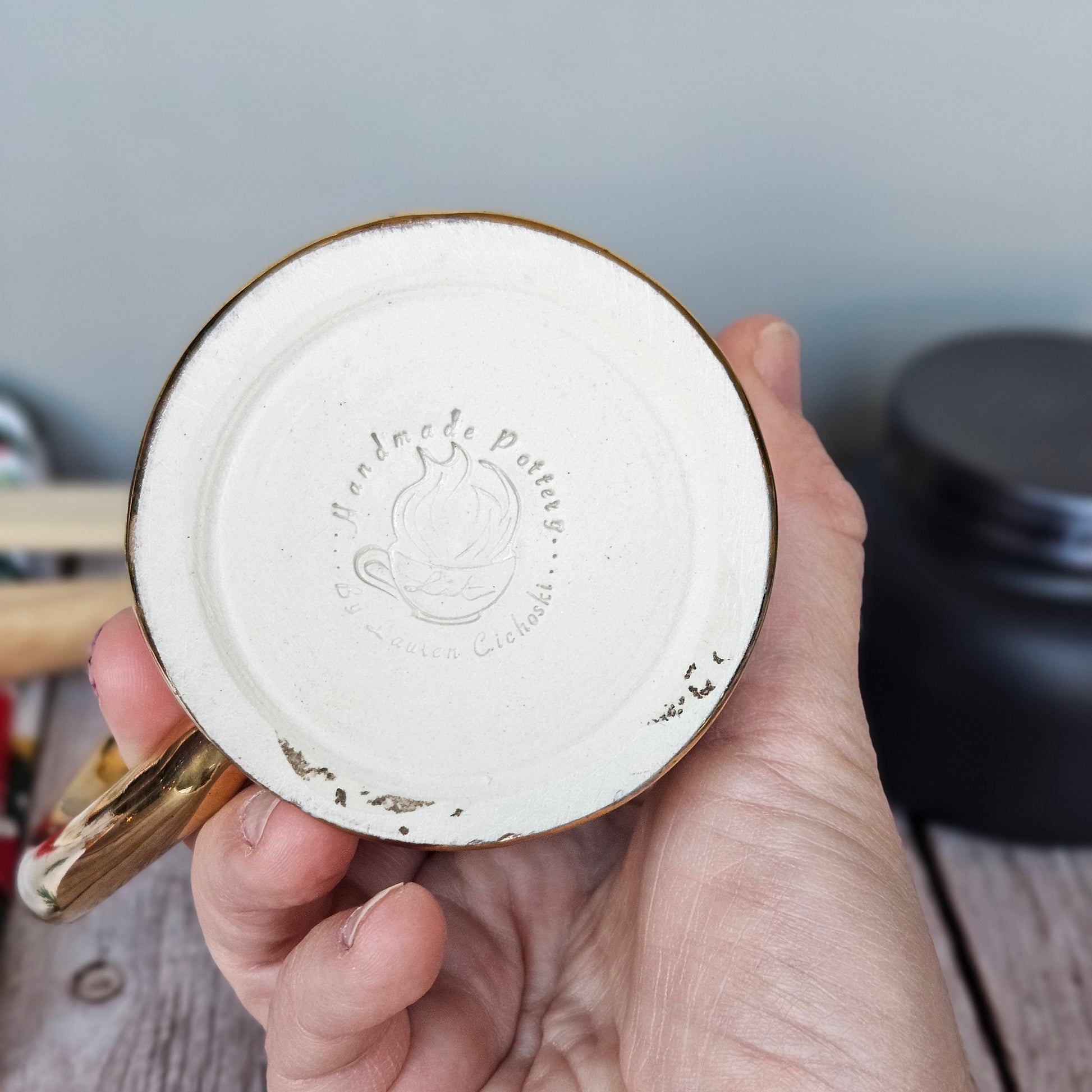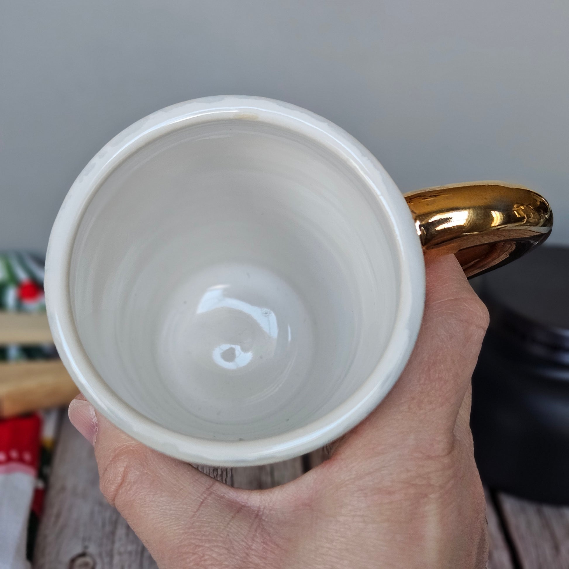 This mug is a 8 oz. hot beverage mug with 22k yellow gold on the handle and foot. Glazed white on the inside and decorated with a beautiful honeycomb pattern with yellow gold embellishments.