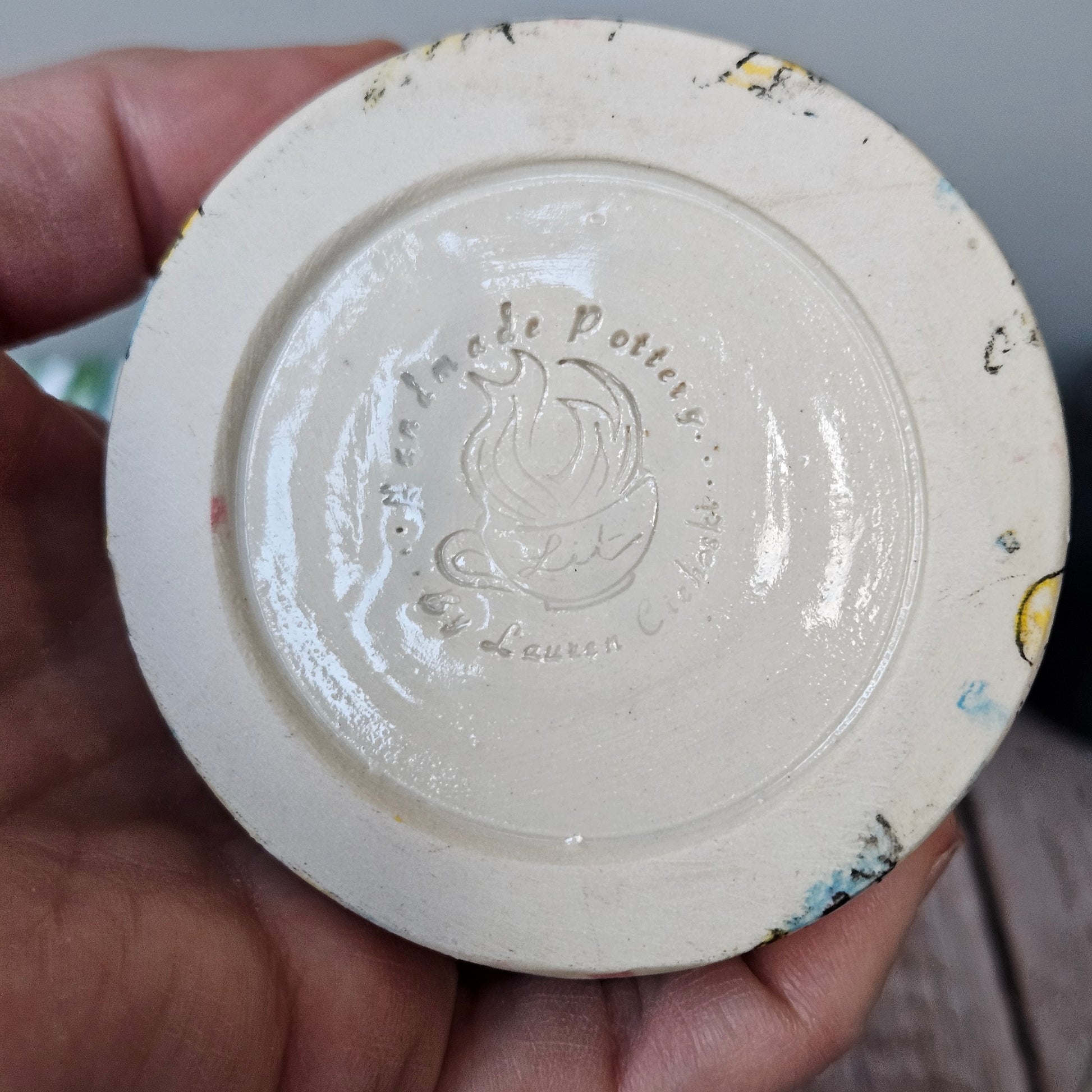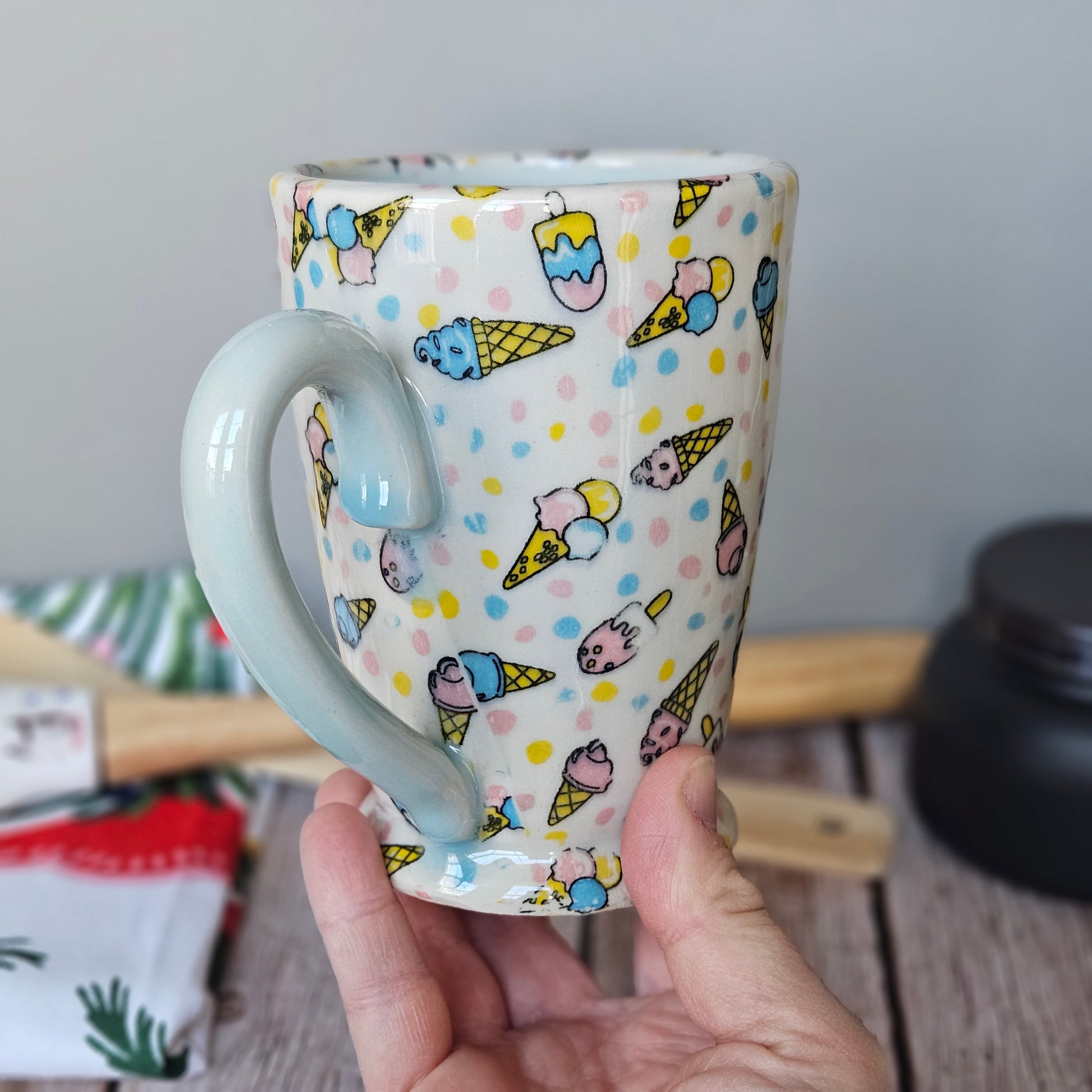 This is a 10 oz. beauty with porcelain as the material. It is dishwasher and microwave safe. It is very lightweight and hand-made.