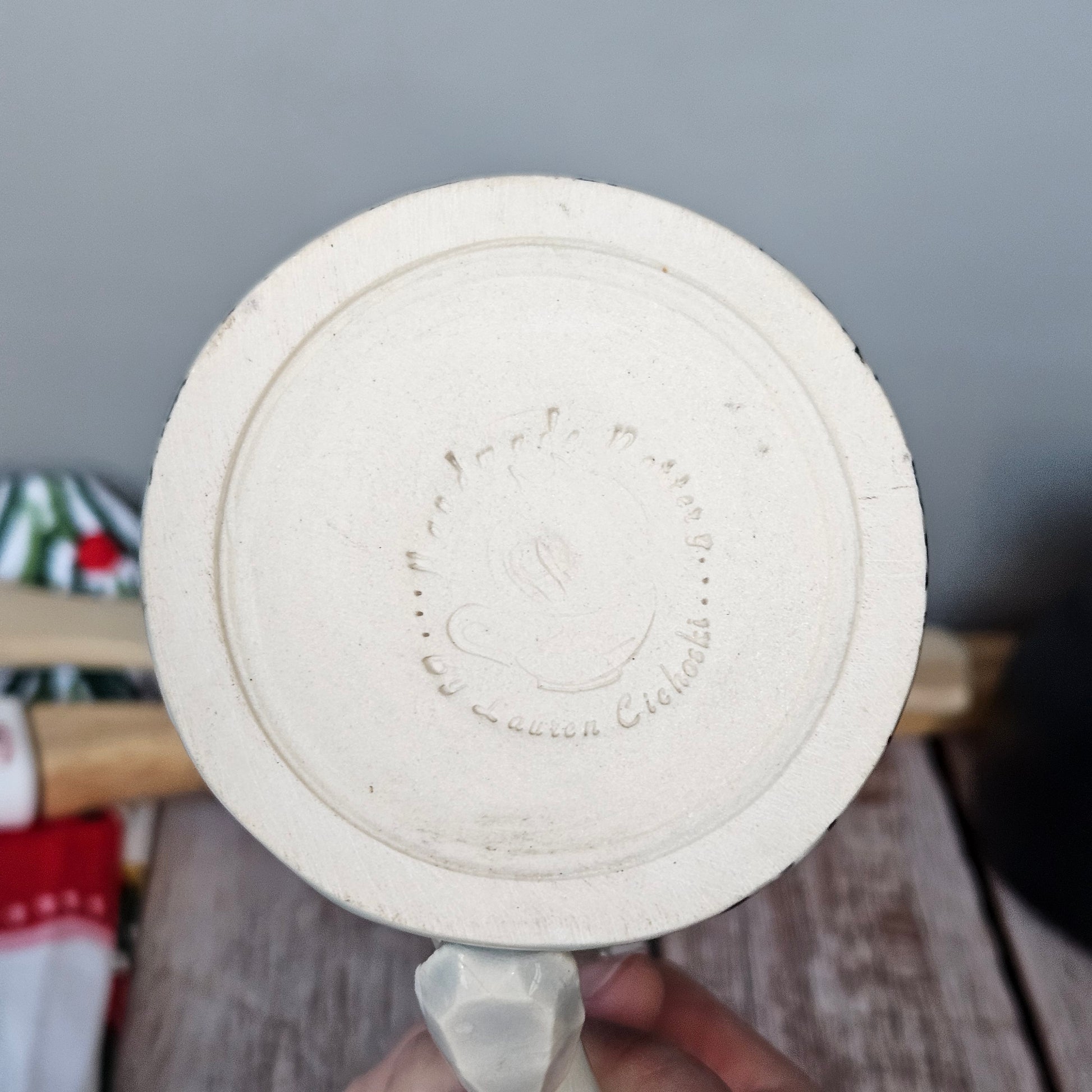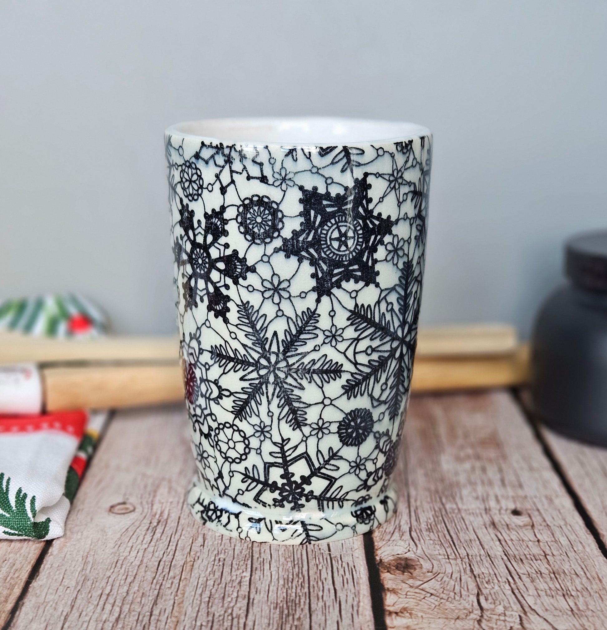 It has a lacey snowflake pattern all around, lined with white glaze and it has 3d snowflakes in low relief to the handle.