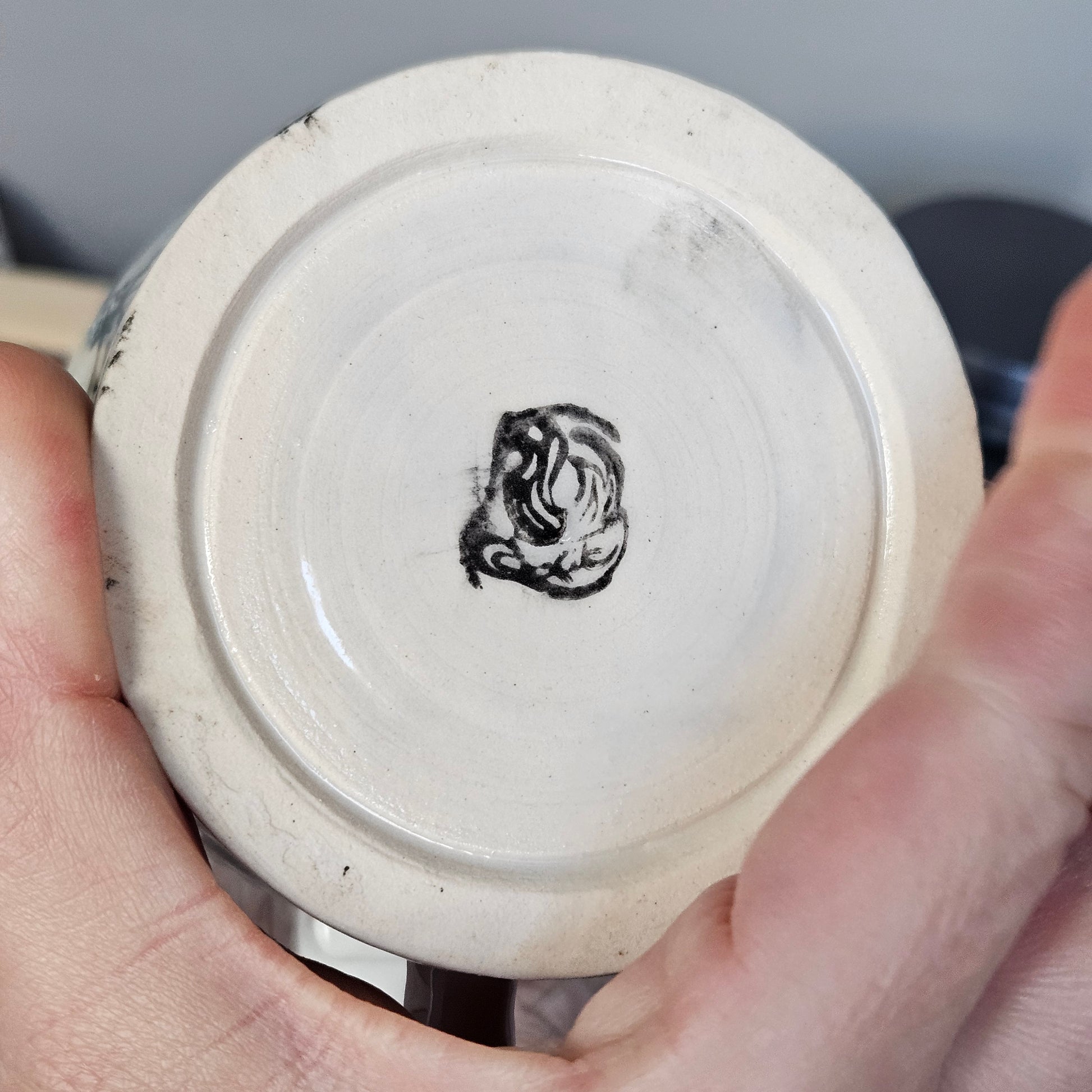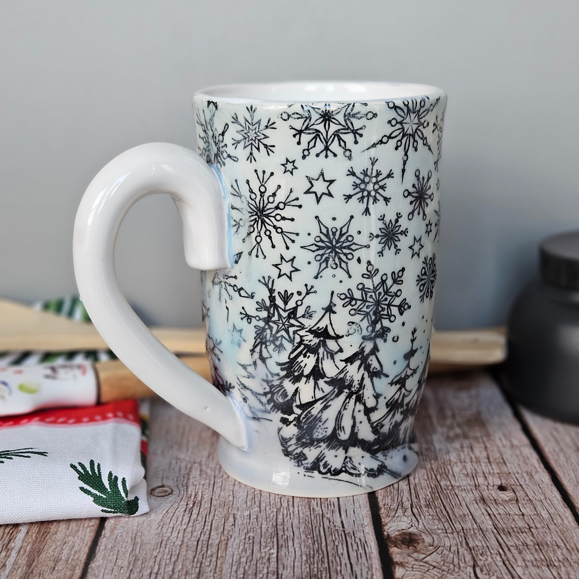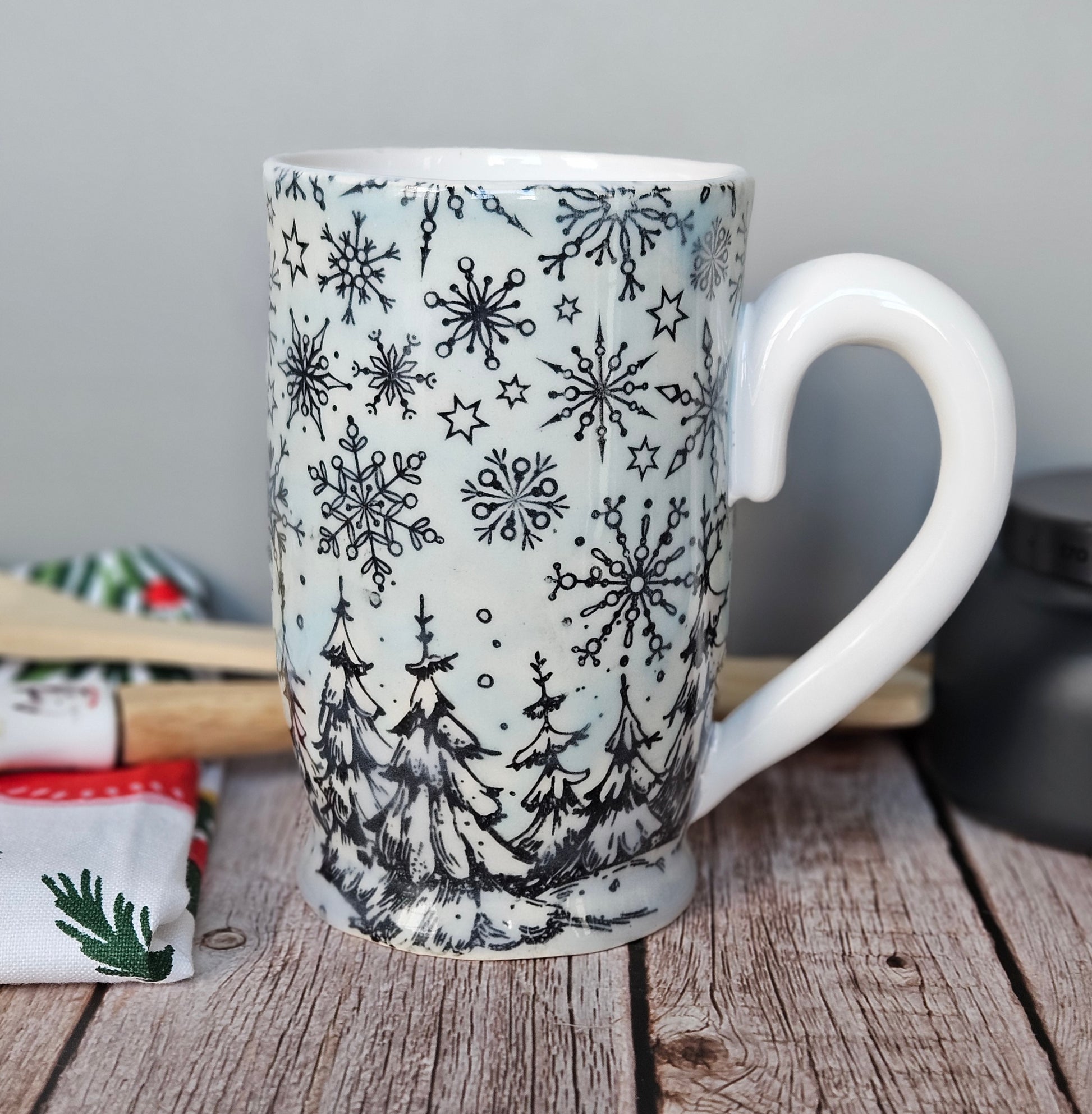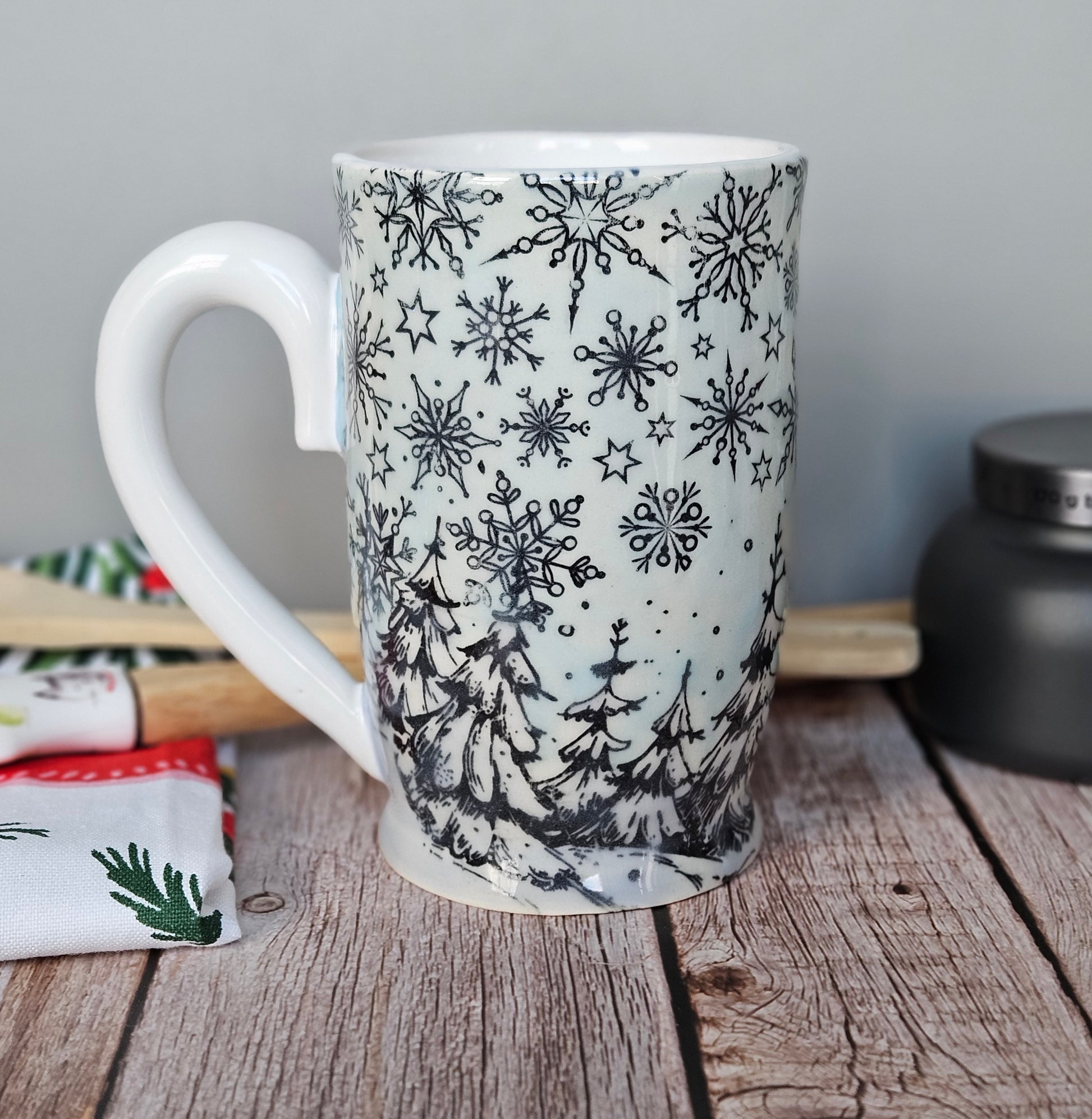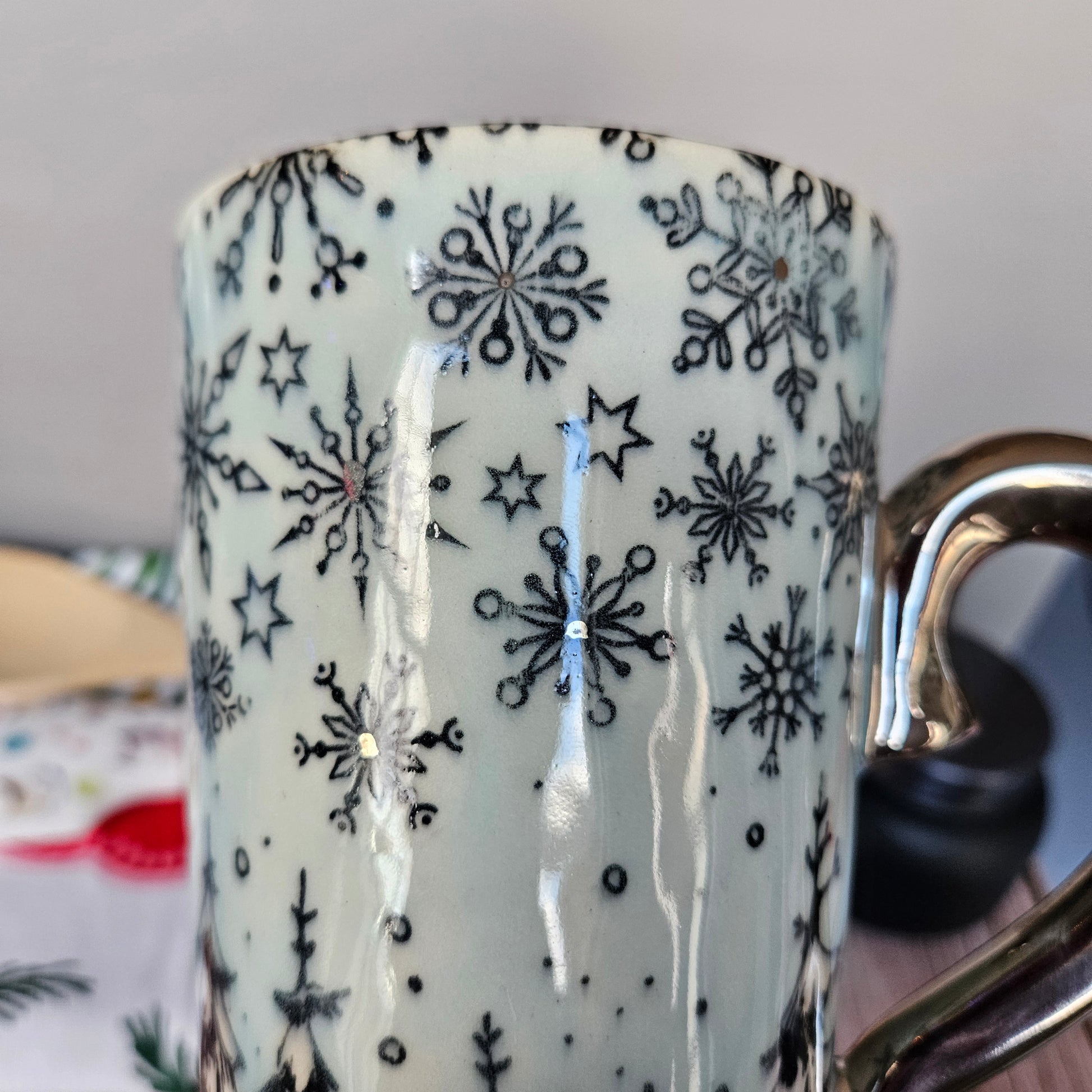 So 22k on the handle, pale blue interior and exterior and this baby comes in 22k white gold. You can use it as a trophy for Hallmark movie trivia night, to drown your sorrows while contemplating your life choices (I do this often while staring out of my sliding door with a perfectly placed scarf, beach waves in my hair, a twinkle in my eye, and a chunky cardy, or simply to enjoy trying to drowning yourself in the shallow well of this mug because you realize that no one is going to look at you the way that Uncle Jesse looks at those pumpkins. Also if you try to brain yourself with this mug because you have failed at trying to drown in 5 inches of water, you will find that this material is fine quality porcelain and with the pattern being under the glaze, you could whack yourself several times and go nighty night and the mug will still look amazing when you regain consciousness.