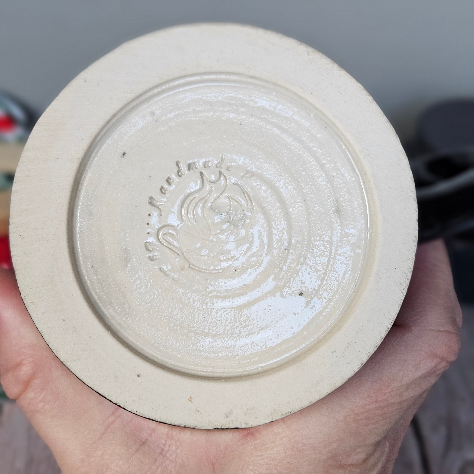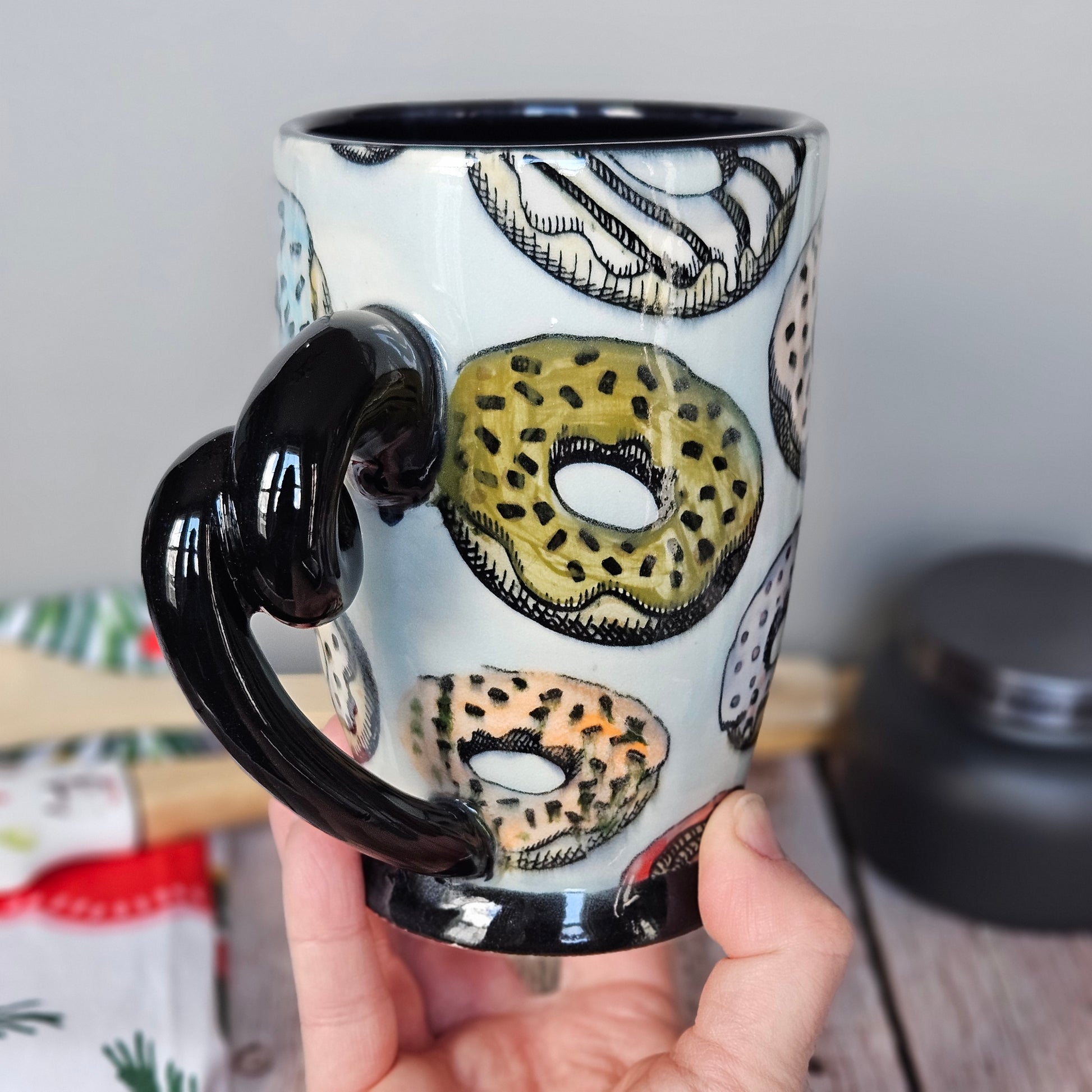 This is a 10 oz. mug with a beautiful donut pattern around the outside of the handle. There is also a black pigtail handle and black foot on the bottom. It is microwave safe and dishwasher safe.