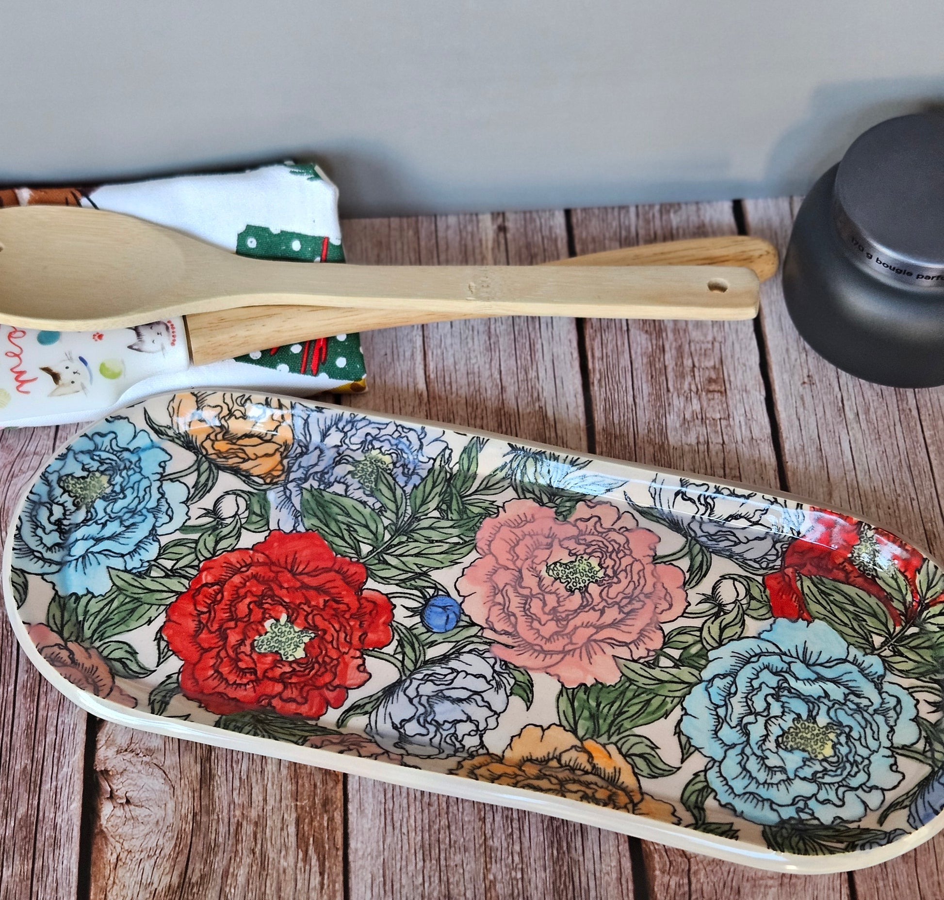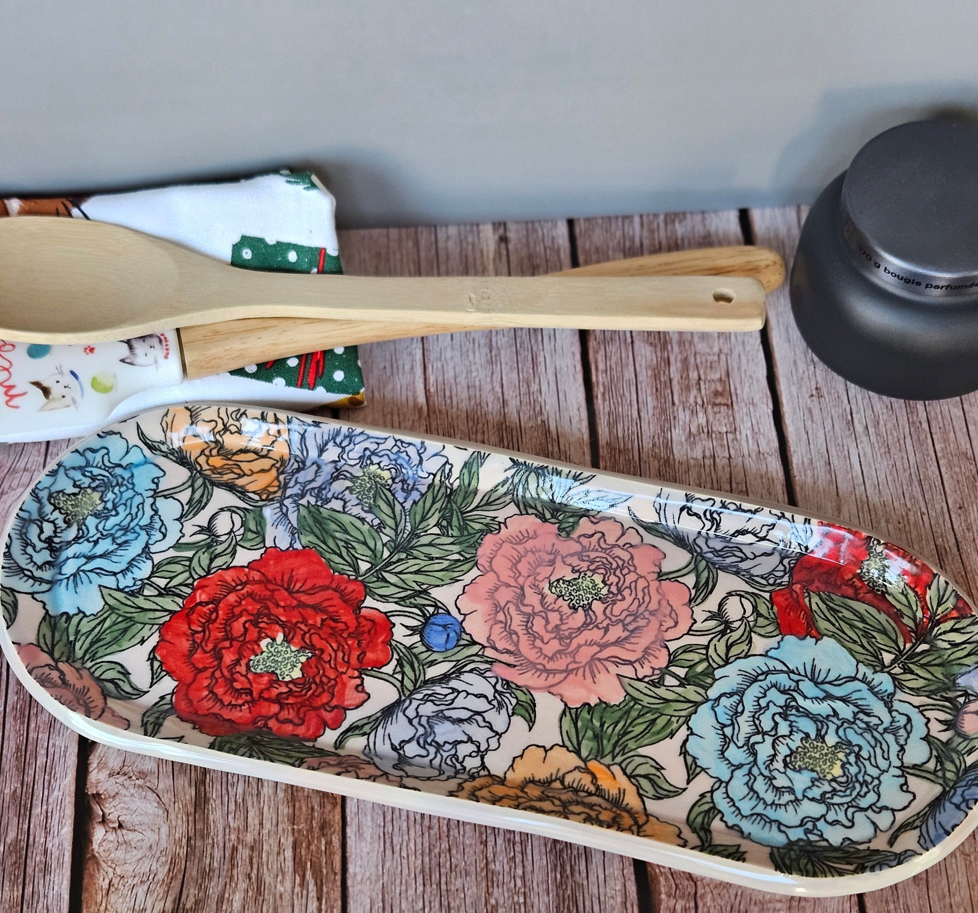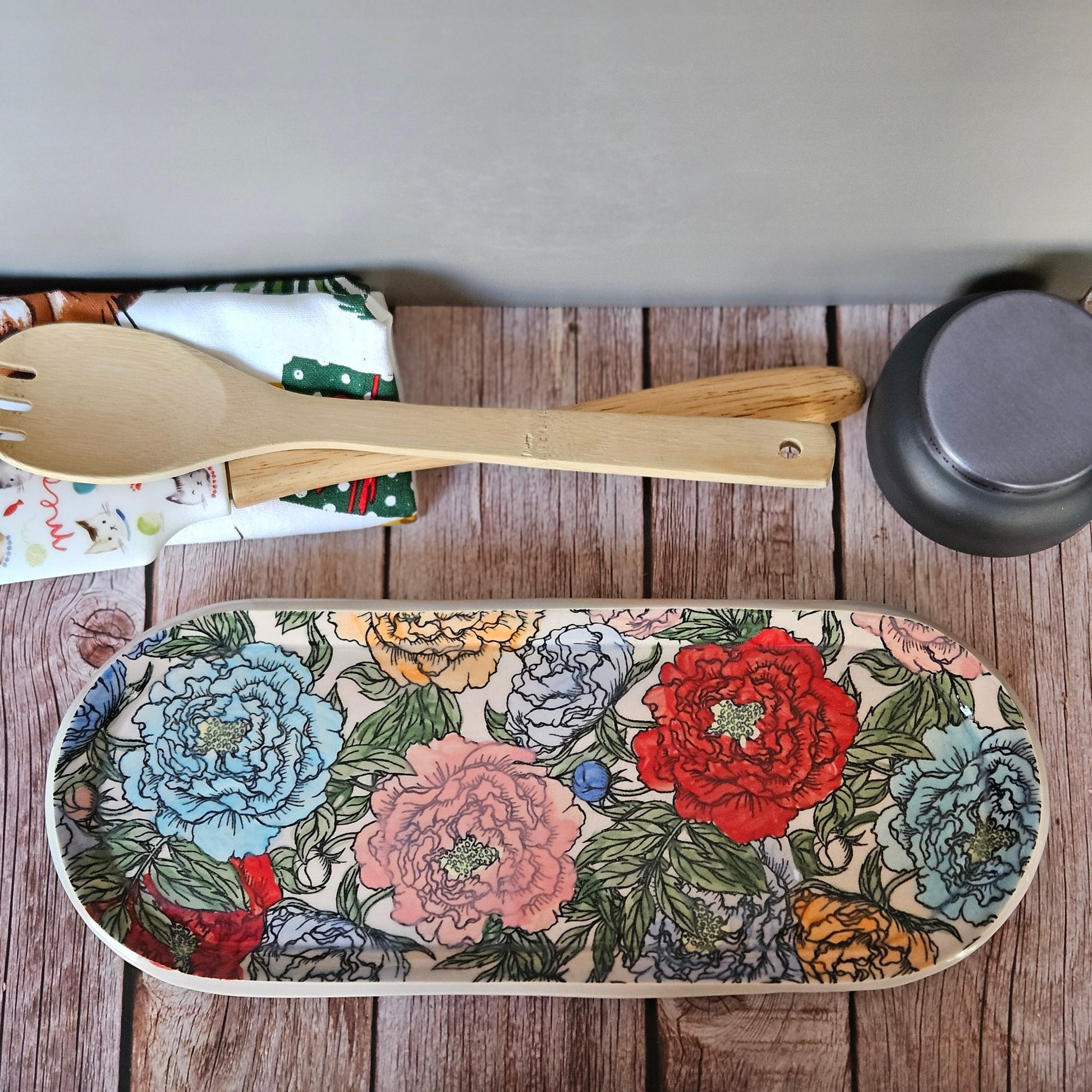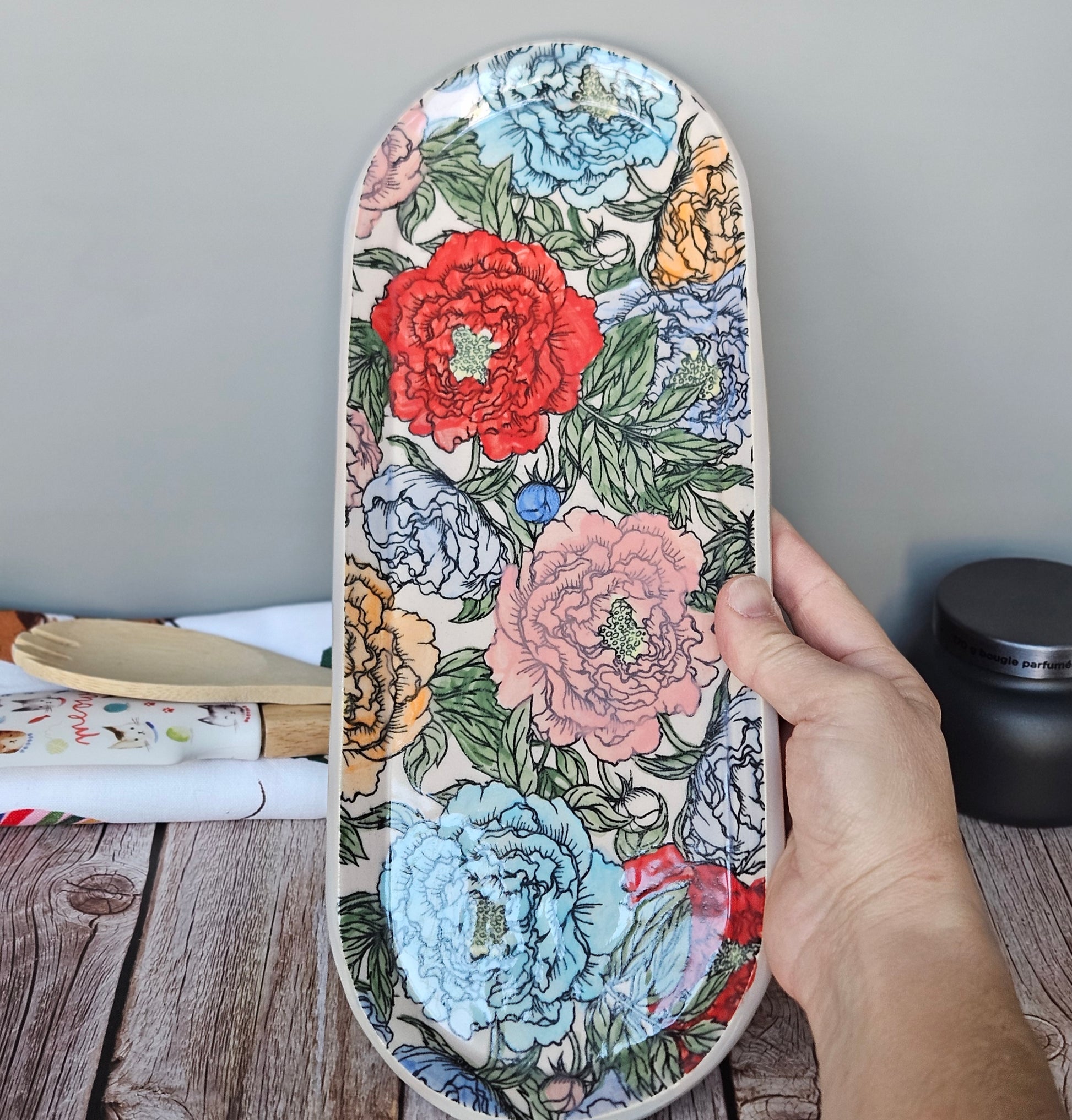 This plate is a beautiful long plate with various colors painted onto a peony garden. The plate is made from porcelain and it is dishwasher and microwave safe.