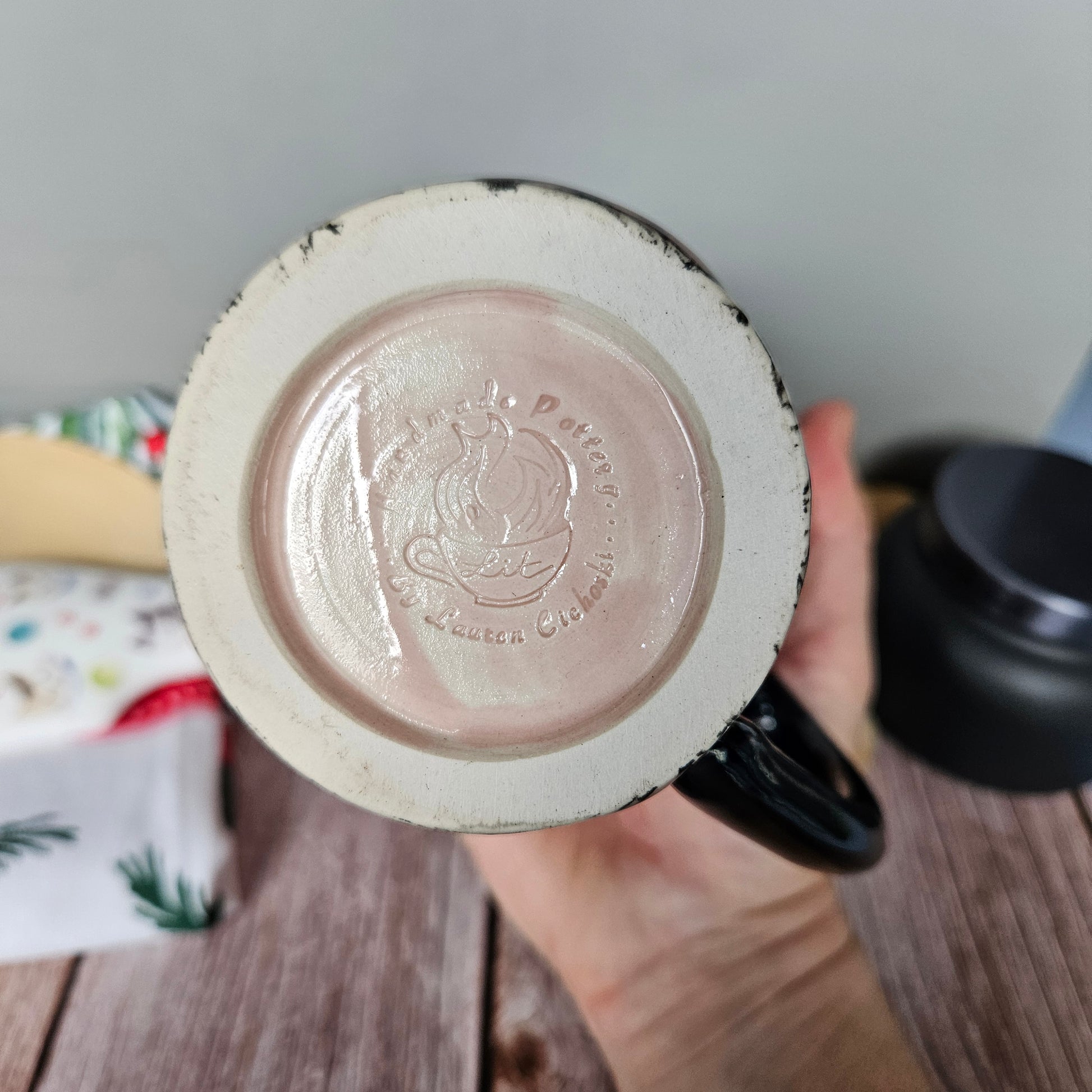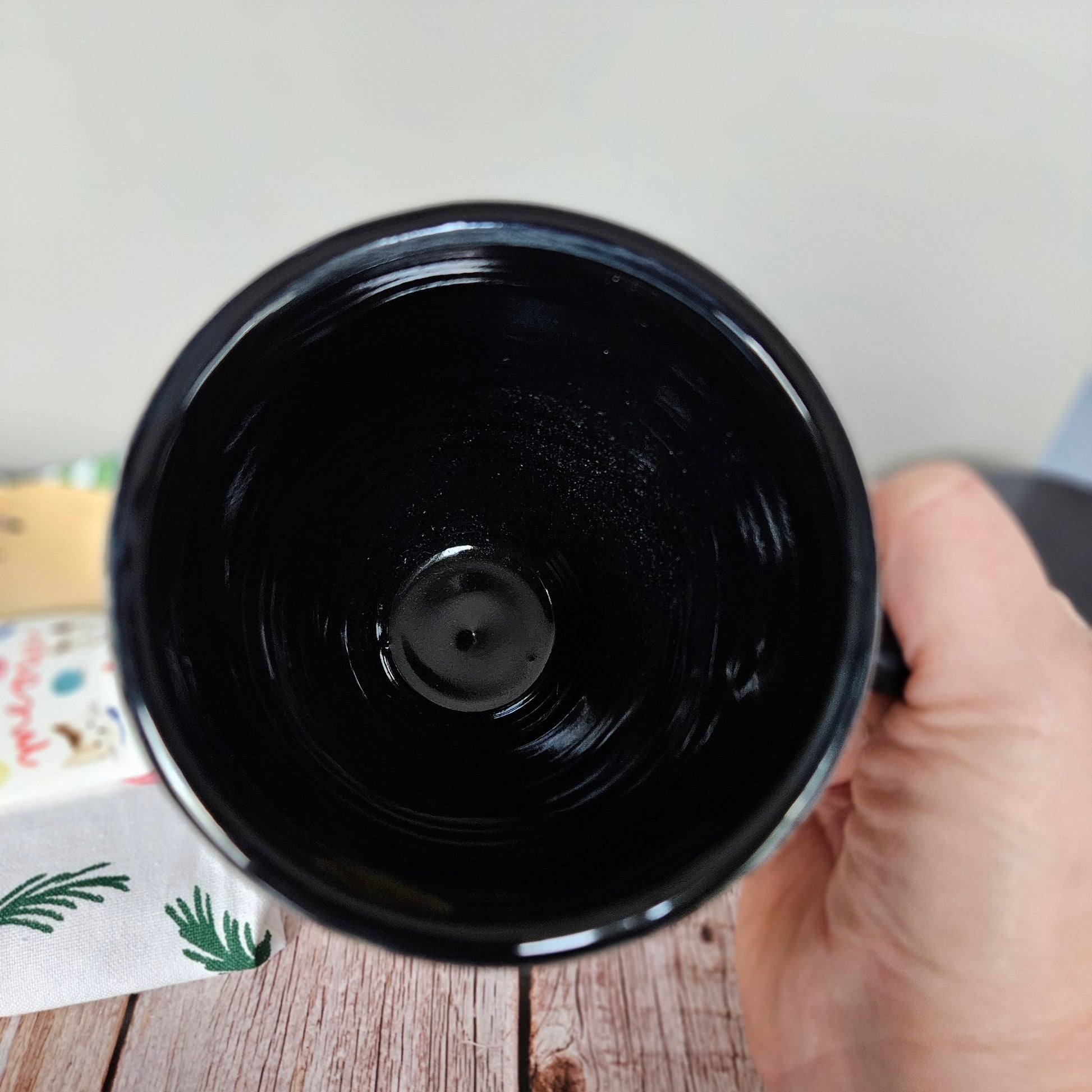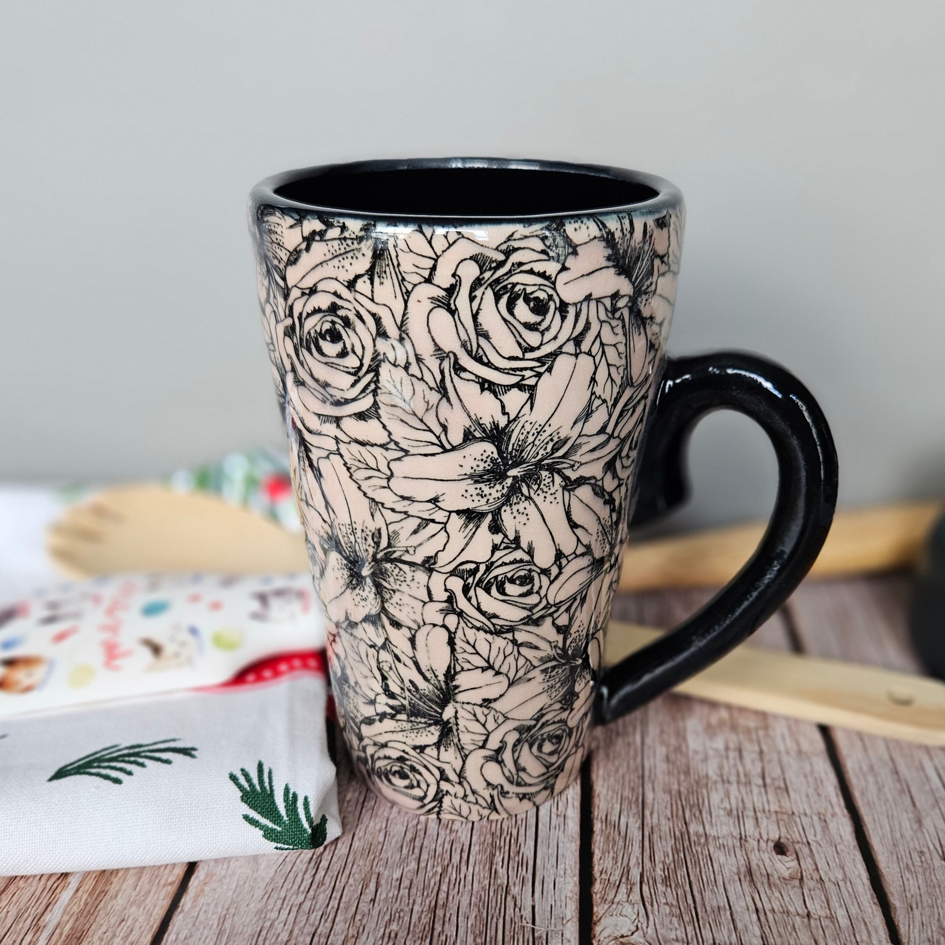 This is a 12 oz pink on the outside, black on the inside, tapered mug with lilies and roses in a pattern. It is dishwasher and microwave safe. It is black inside and has a black handle. It has a pattern under the glaze, so no chipping or fading.