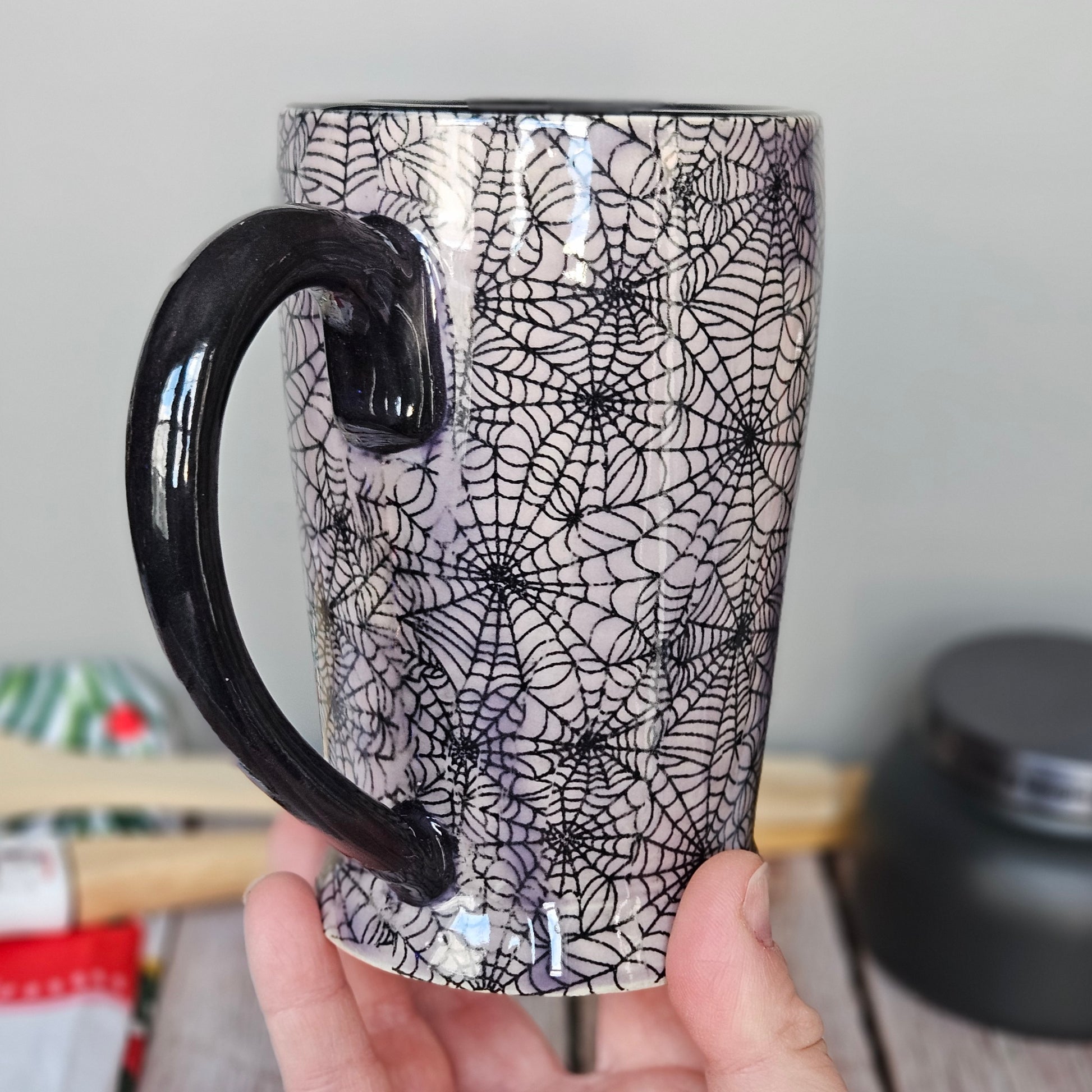 This is a beautiful lavender mug with a decal in the middle. It has a beautiful spiderweb pattern wrapped around and an apothecary label with a spider on it.