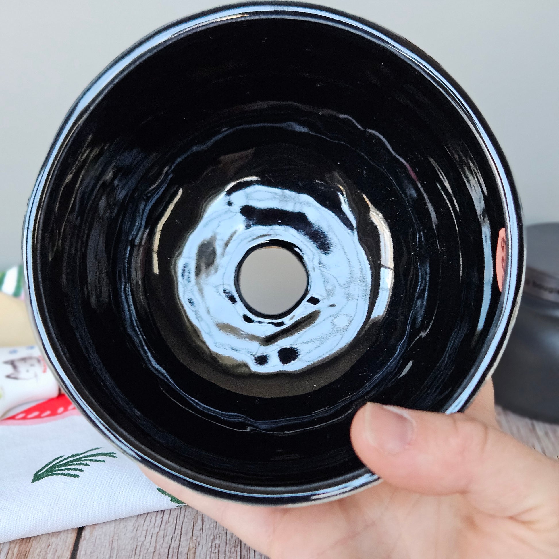 This is a 6 inch in diameter hanging planter with macrame cord hanger. The bowl has a 1 inch drainage hole for plants. This is made with porcelain and glaze and stands 4 inches high and 6 inches wide. It is lightweight and decorated with handpainted mandalas.
