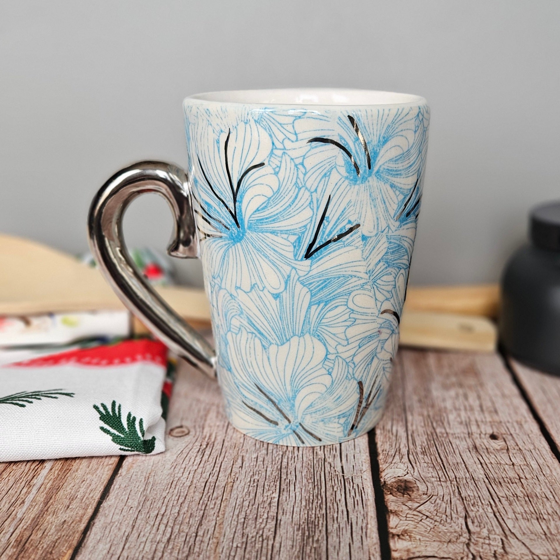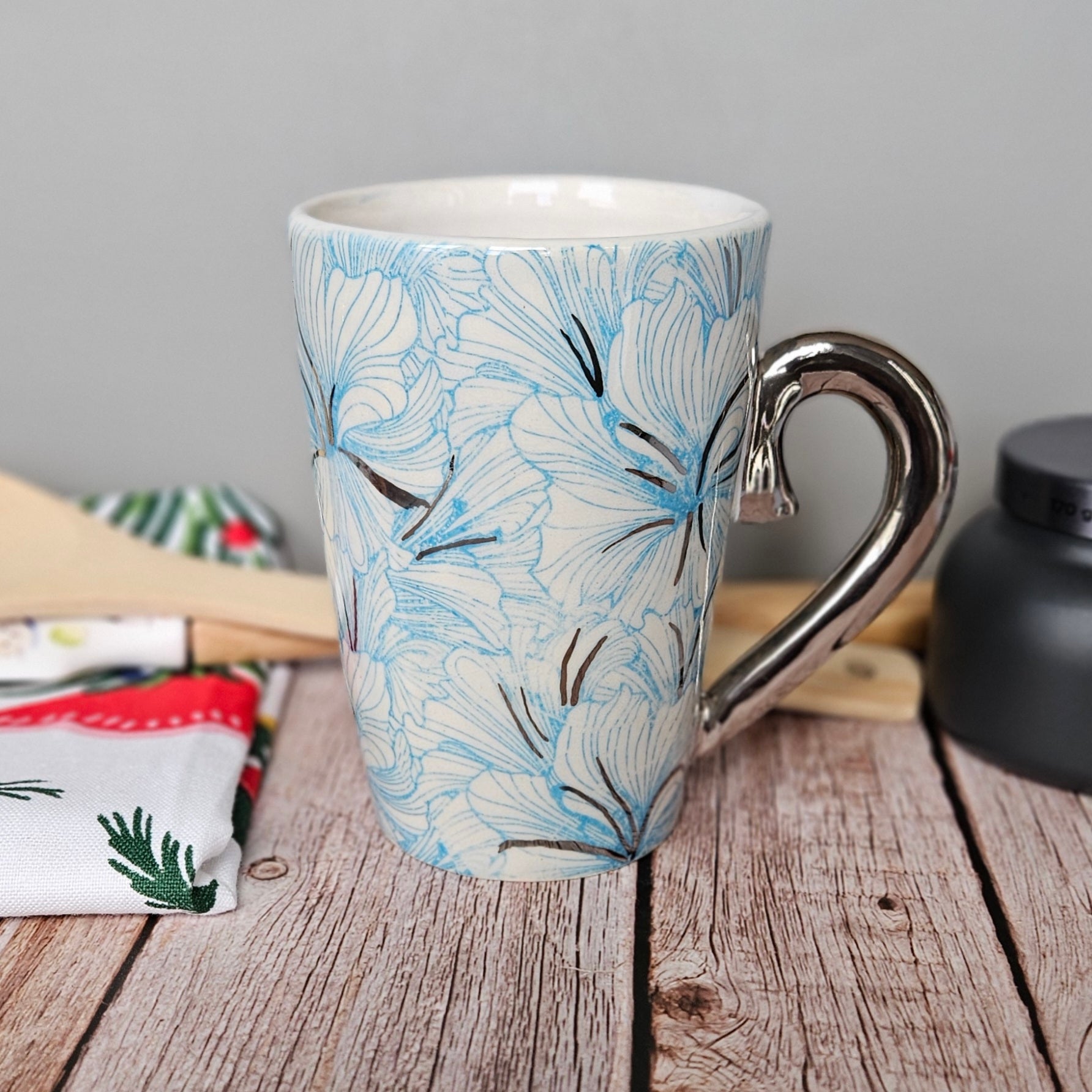 This is a 10 oz blue and white porcelain hibiscus mug with a 22k white gold handle and accents. It is white in the interior and the pattern is under the glaze, so it won't chip or fade.