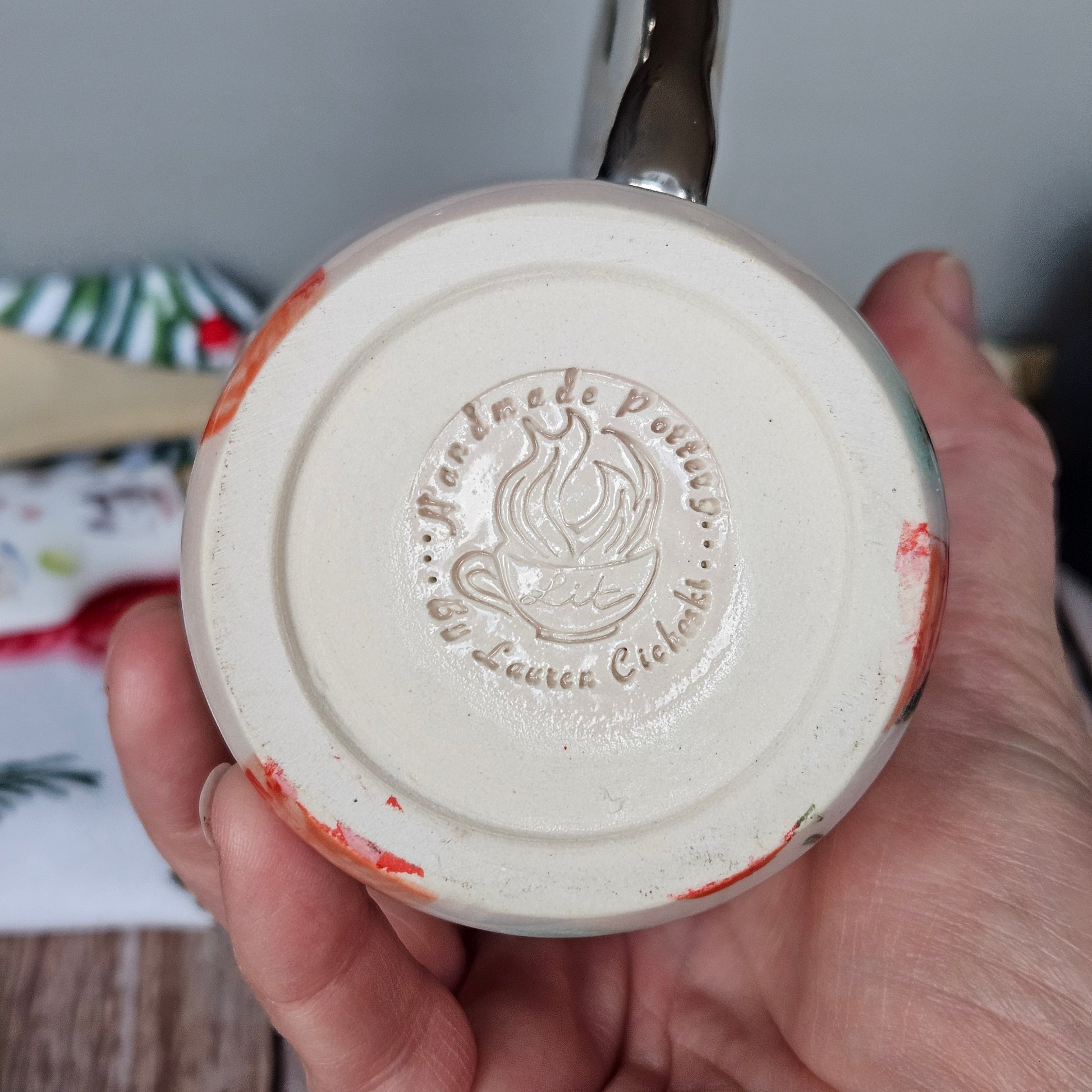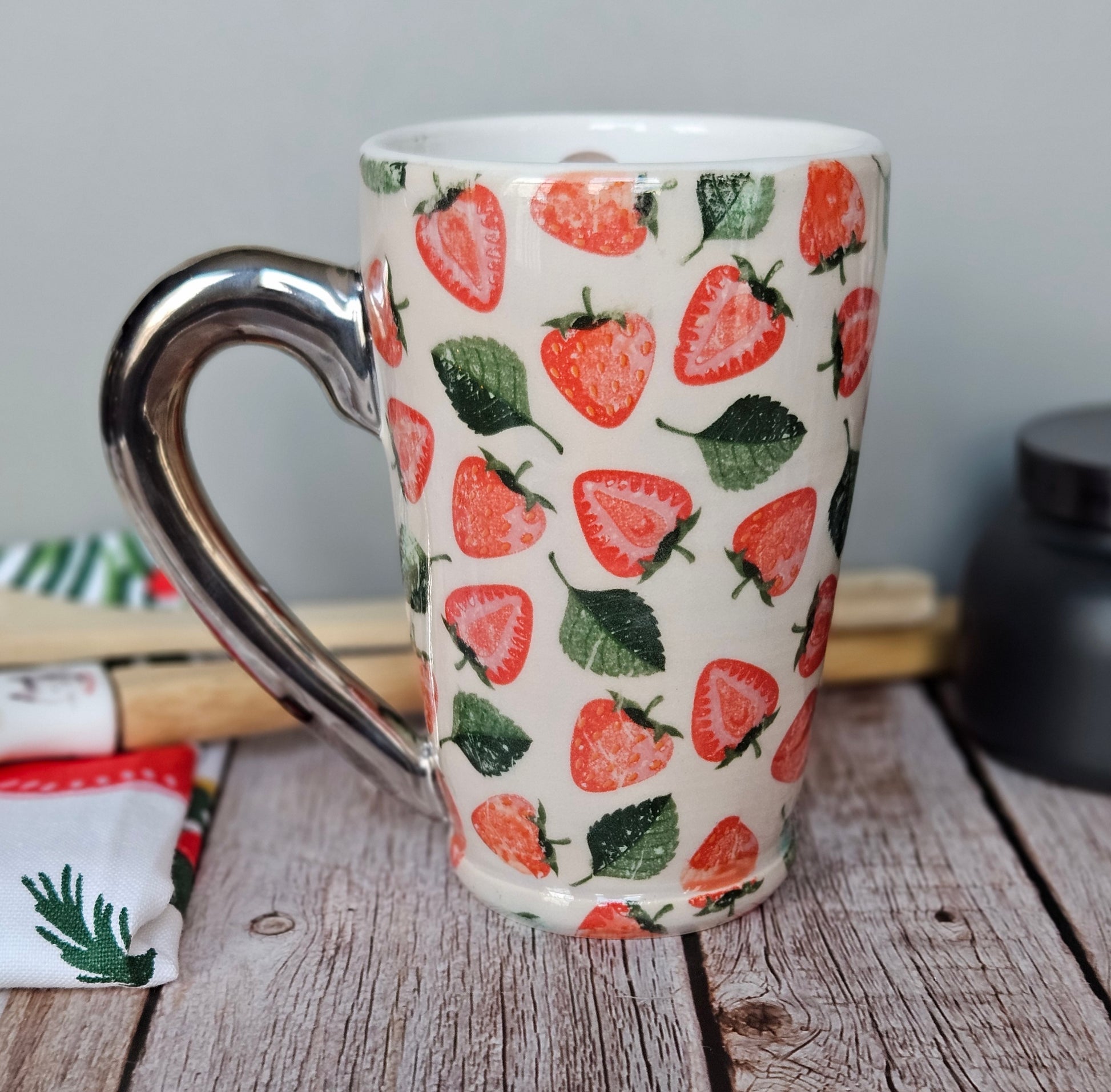 This is a beautiful 22k white gold handled strawberry mug. It holds 10 oz. and she is gorgeous with strawberries all around the outside and pure white glaze on the inside.