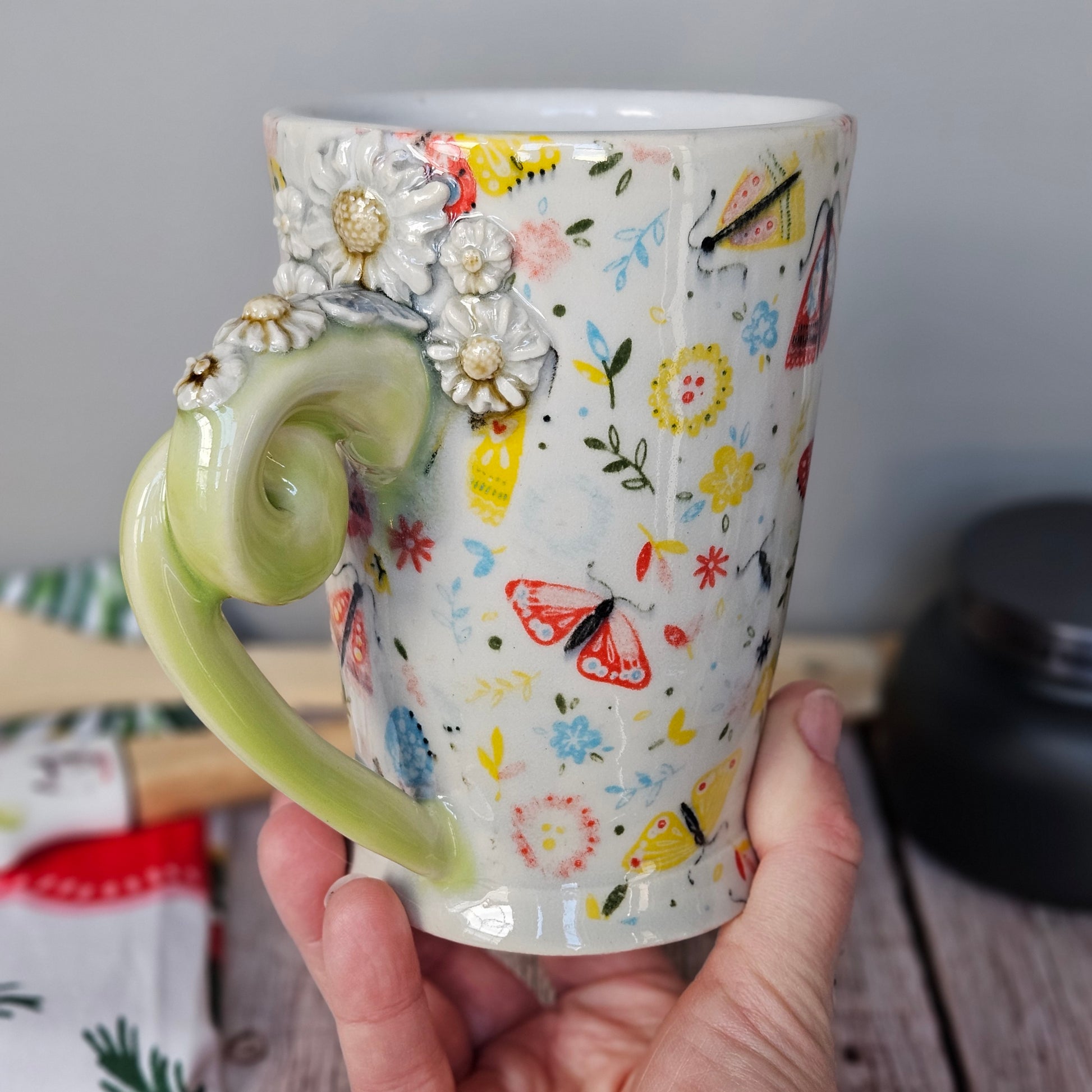 Yellow-Green and white floral and butterfly mug with pigtail handle